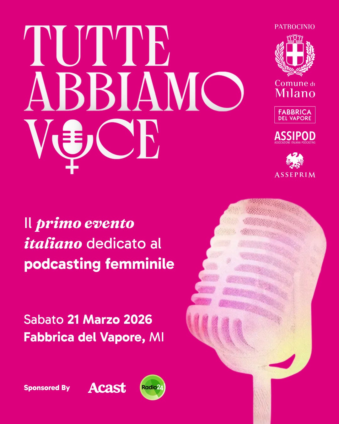 L’evento è patrocinato da Comune di Milano, ASSIPOD, ASSEPRIM e Fabbrica del Vapore, sponsorizzato da ACAST e Radio 24, e supportato da una squadra di fortissimi partner tecnici. Non vediamo l’ora di ospitarvi; trovate tutti i dettagli nella sezione Podcuriosity!